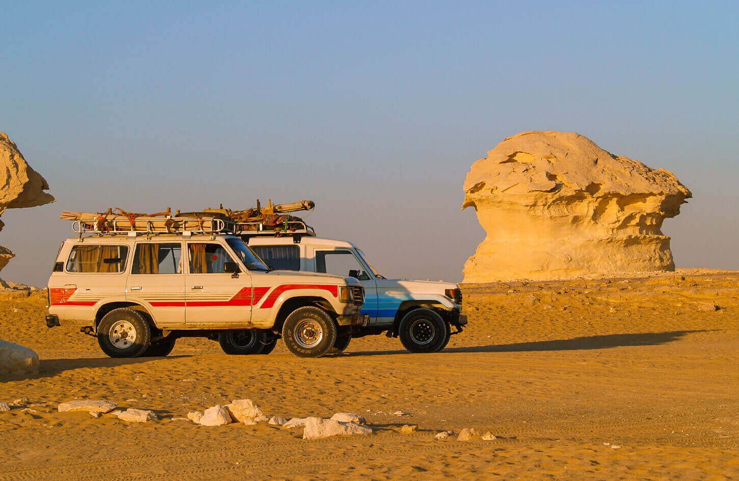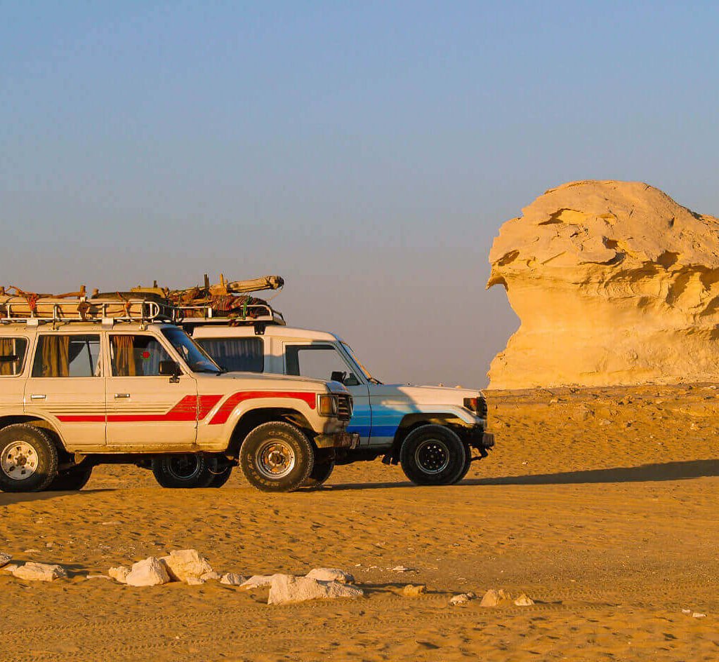 Despiértese con el aire fresco del desierto y un abundante desayuno, y prepárese para un emocionante día de exploración. Suba a un robusto Land Cruiser, listo para atravesar el variado terreno desértico de Egipto, desde suaves carreteras hasta indómitos caminos todoterreno.
